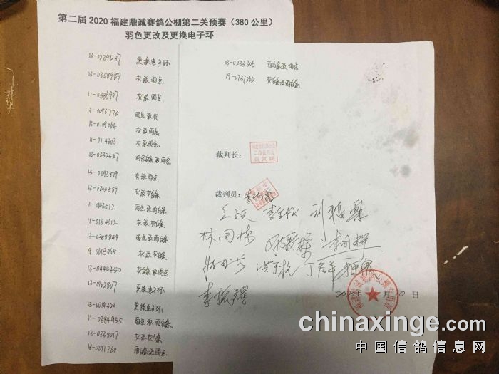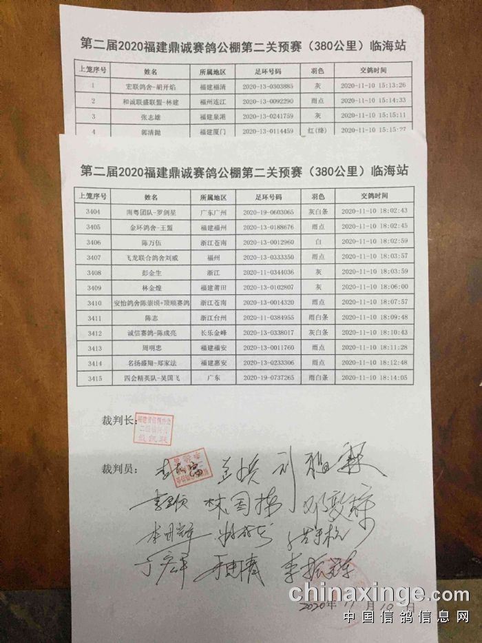 福建鼎诚赛鸽公棚于2020年11月10日进行第二关预赛(380公里)集鸽工作,经过逐羽扫描,现有参赛鸽共3415羽。现将有关工作情况公告如下: