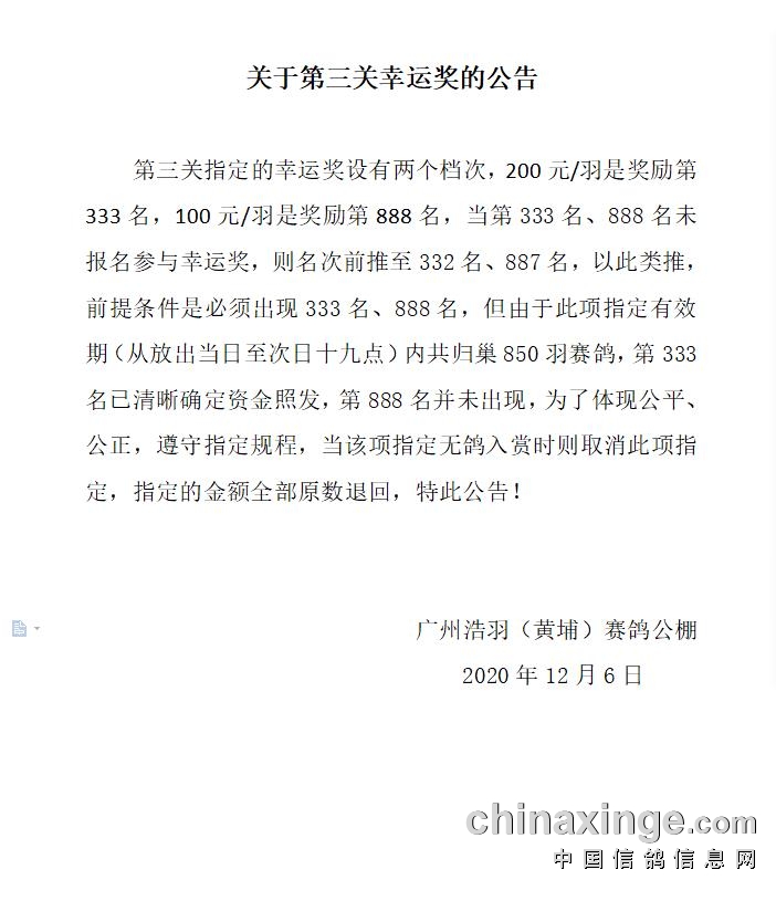 广州浩羽(黄埔)公棚关于第三关幸运奖的公告