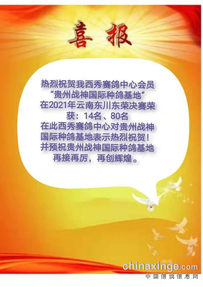 喜报 热烈祝贺我西秀赛鸽中心会员“贵州战神国际种鸽基地”
