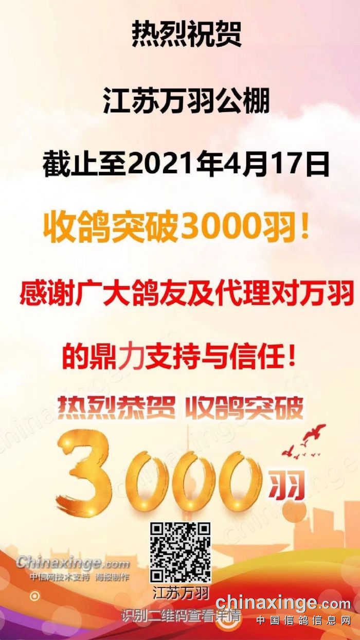 热烈祝贺江苏万羽公棚收鸽突破3000羽