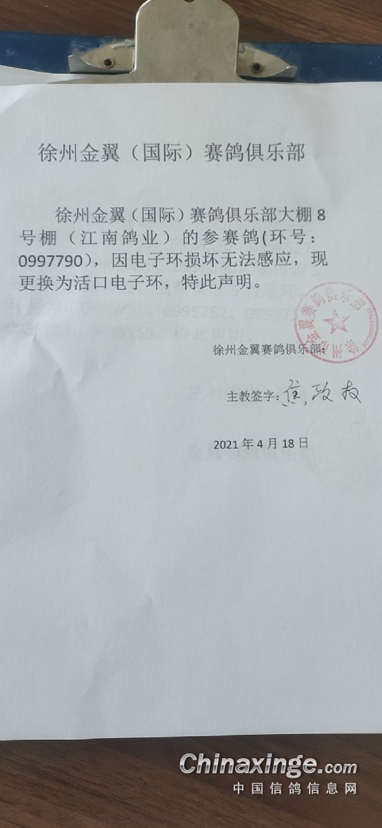 徐州金翼(国际)赛鸽俱乐部电子环更换通知