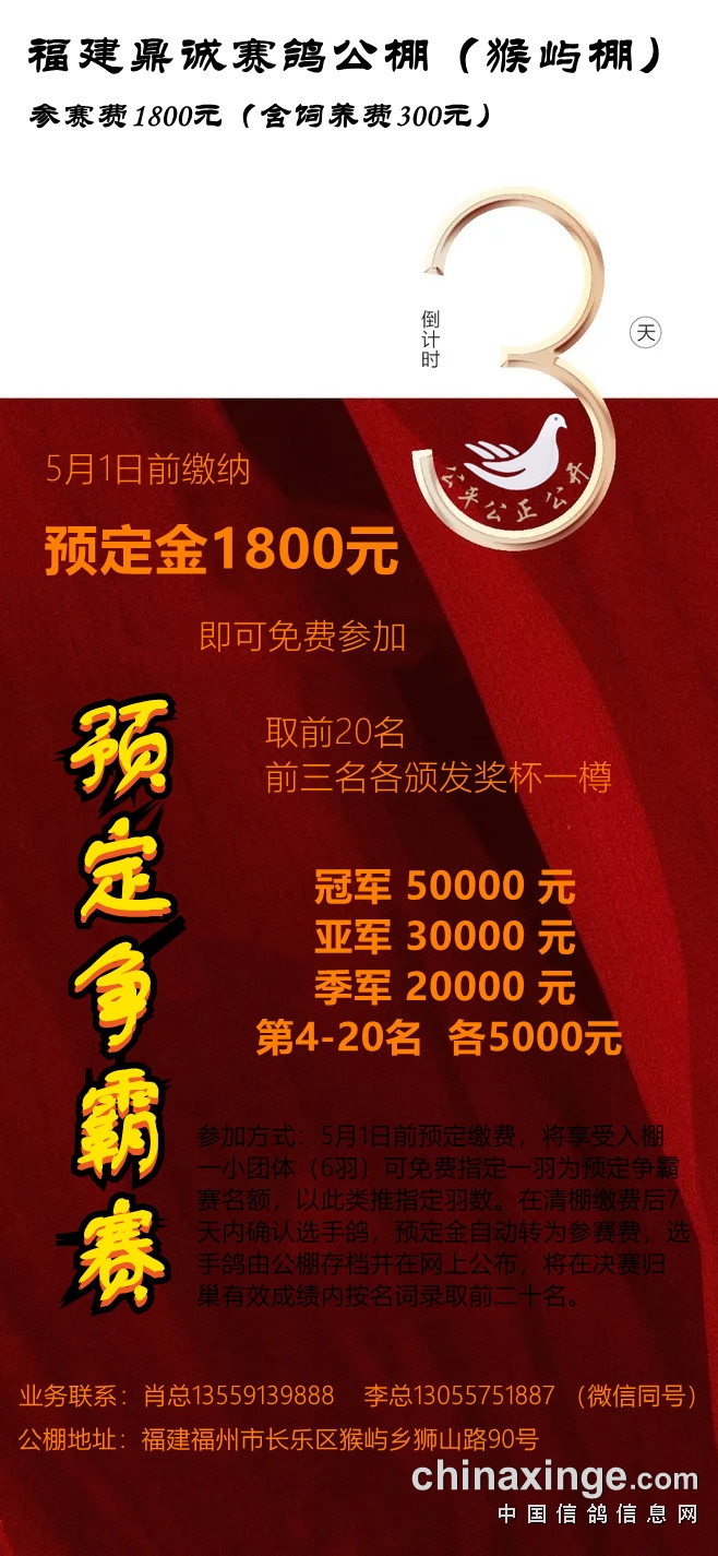 福建鼎诚赛鸽公棚(猴屿棚)- 预定享预定金争霸赛倒计时3天