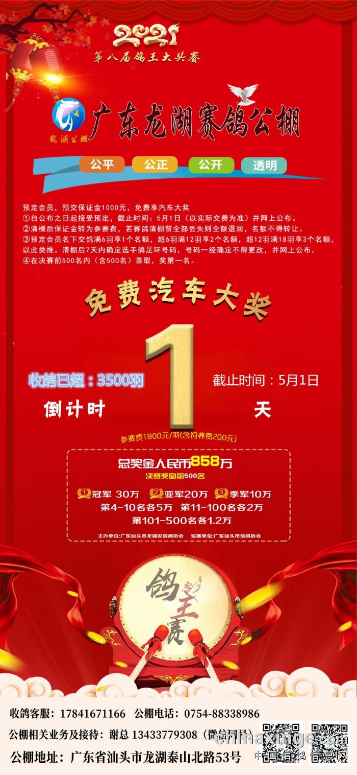 广东龙湖赛鸽公棚-预定享免费汽车大奖赛倒计时1天,截止时间:5月1日