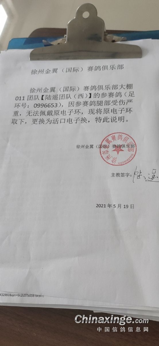 徐州金翼国际赛鸽俱乐部大棚11号团队(陆遥团队西)的参赛鸽,足环号为0996653,因腿部受伤严重,无法佩戴原电子环,于2021年5月19日将电子环取下,在腿部伤情好转之后,于2021年6月30日佩戴活口电子环,特此说明。