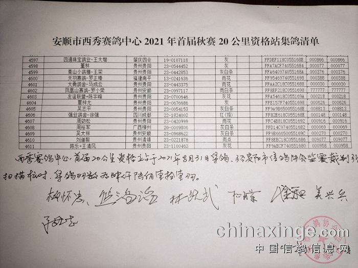 西秀赛鸽:2021年首届秋赛20公里资格站上笼清单
