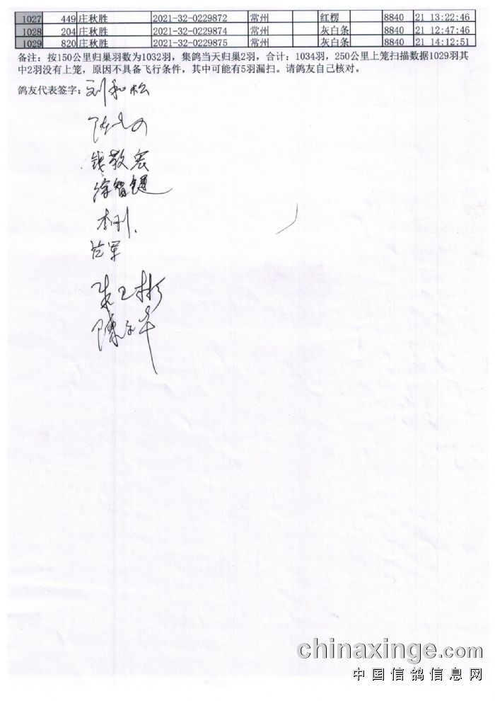2021年秋季250公里测试站上笼数据鸽友代表签字确认单