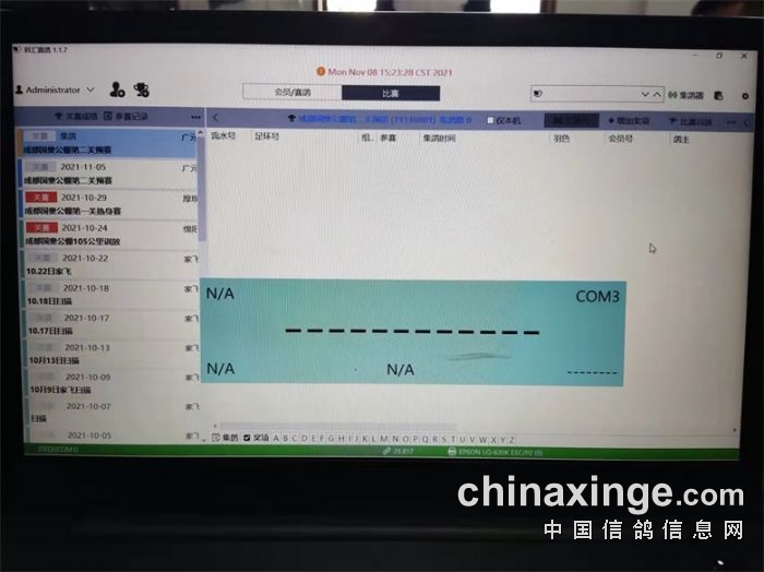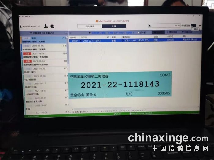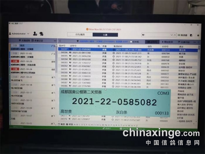 11月8日21:56,集鸽工作圆满完成,共集鸽4397羽,第一羽扫描时间:11月8日15:25,环号为:2021-22-1118143,最后一羽扫描时间:11月8日21:56,环号为:2021-22-0585082,上笼数据真实有效。