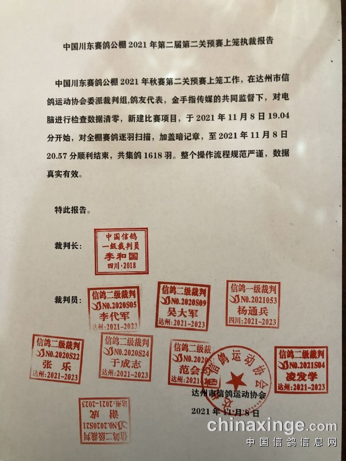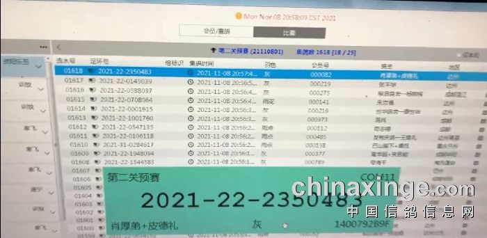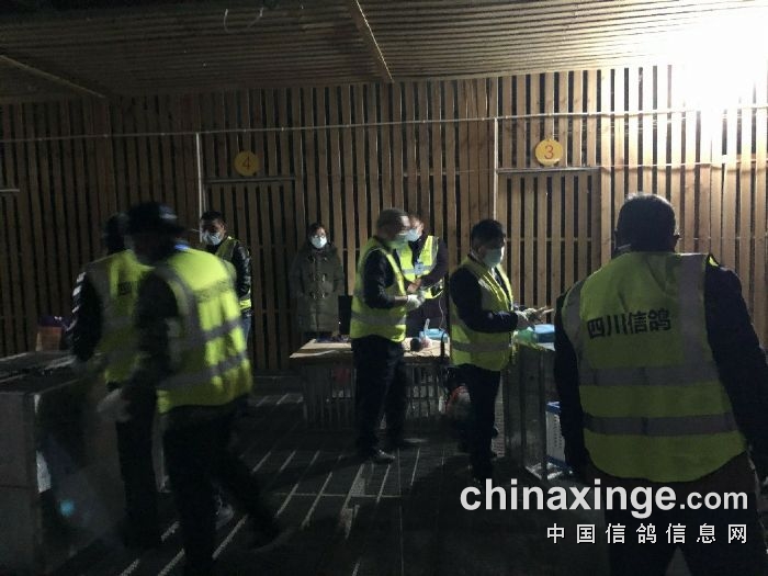 2021年11月8日晚上7时许,随着裁判长宣讲了集鸽的注意事项以及现场纪律之后,集鸽工作正式开始,第一羽扫描时间2021年11月8日7点04分,足环:2021-09-0005255,整个集鸽过程如行云流水般井然有序。截止到晚上8点57分,集鸽工作正式结束,共计集鸽1618羽,最后一羽足环:2021-22-2350483,随即裁判组、鸽友代表以及媒体组一同前往本次预赛的司放地:资阳。