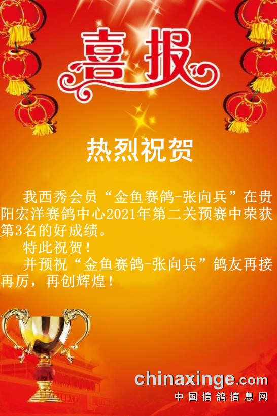 西秀赛鸽:热烈祝贺“金鱼赛鸽-张向兵”
