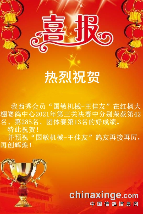 西秀赛鸽:热烈祝贺“国敏机械-王佳友”