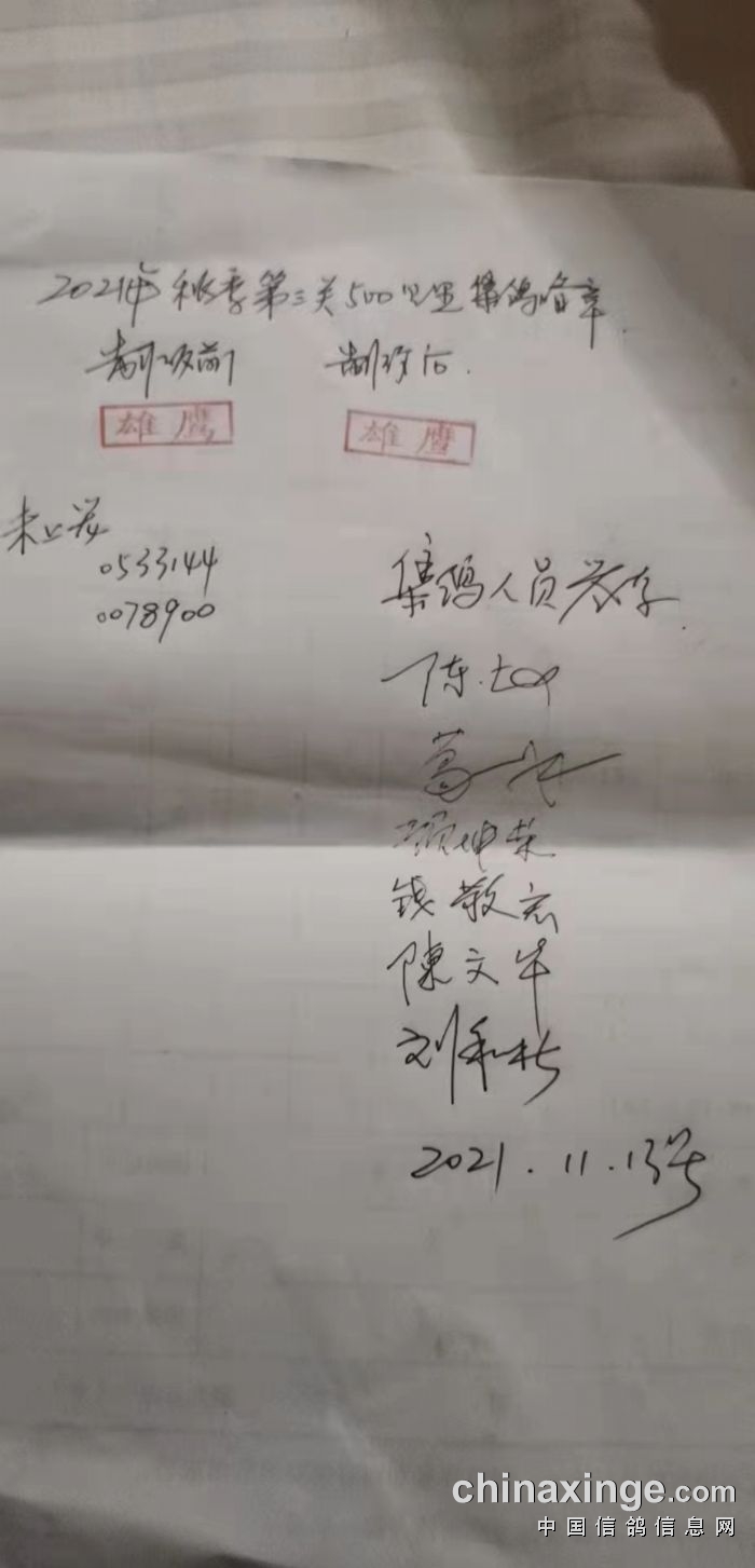 2021年秋季第三关500公里上笼扫描数据在场监放鸽友证明签字