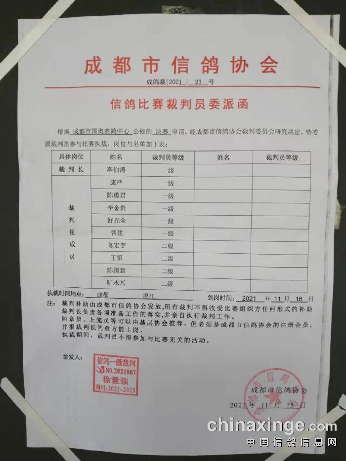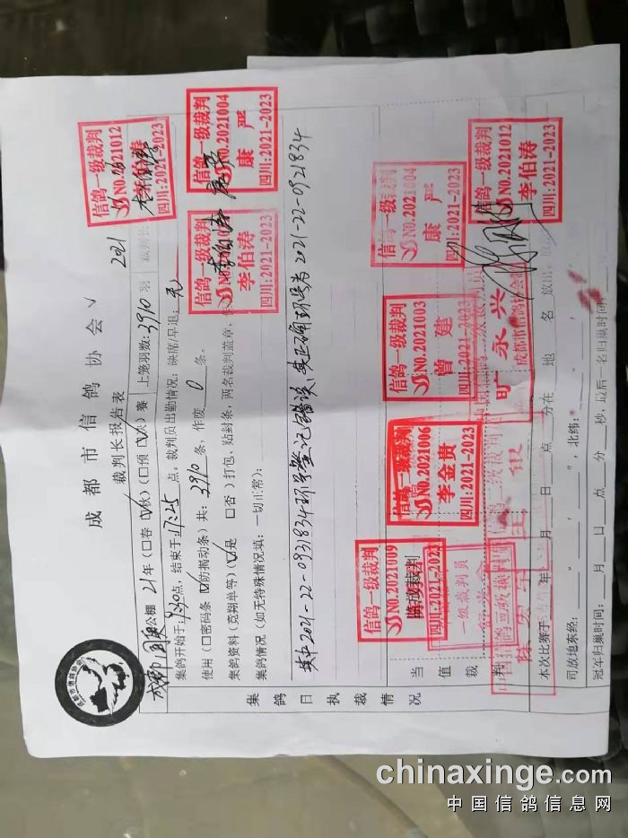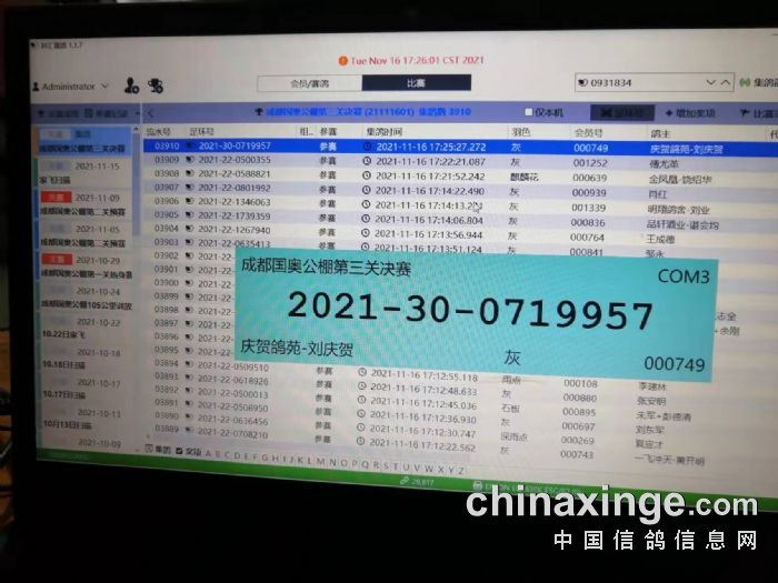 成都国奥(国际)赛鸽中心2021年第12届第3关总决赛集鸽上笼在成都市信鸽协会委派的裁判组,鸽友代表,直播媒体的共同监督见证下于2021.11.16日上午9.30分第一羽2021-22-2222994上笼拉开了集鸽序幕,裁判组对全棚的赛鸽逐羽扫描,盖暗章,唱环,上笼,并同步打印备查。整个集鸽流程规范.严谨.有序。整个集鸽过程由成都市鸽协委派的裁判人员完成。至11.16日下午17:25分最后一羽上笼:2021-30-0719957结束,共计集鸽羽数3910羽,数据真实有效。