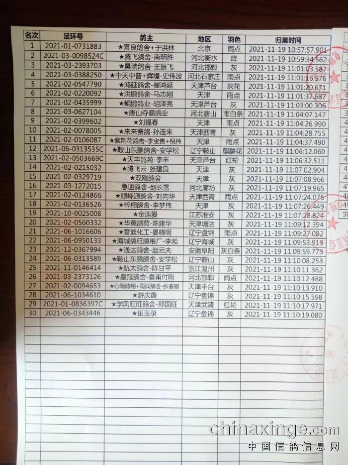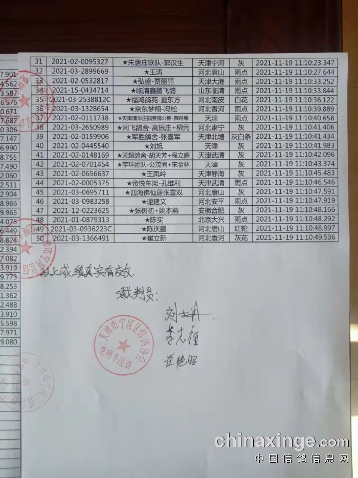 天津信泽慧海公棚300公里速度赛前五十名成绩单