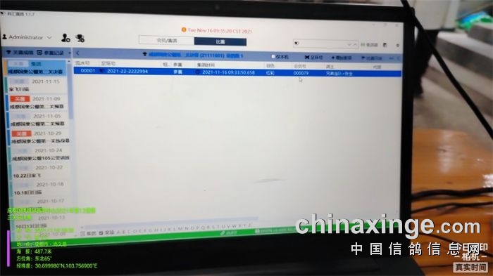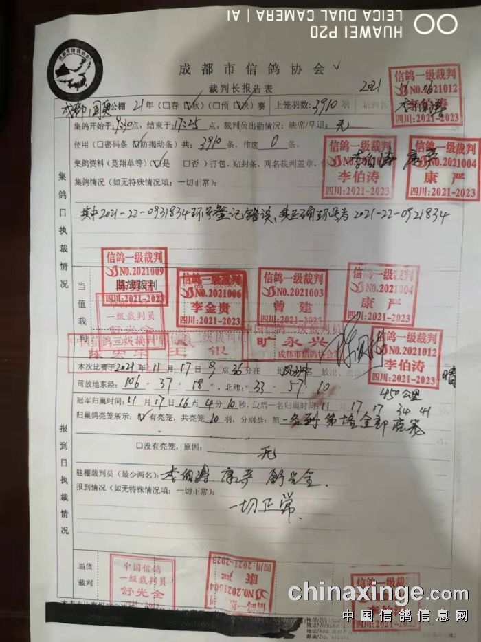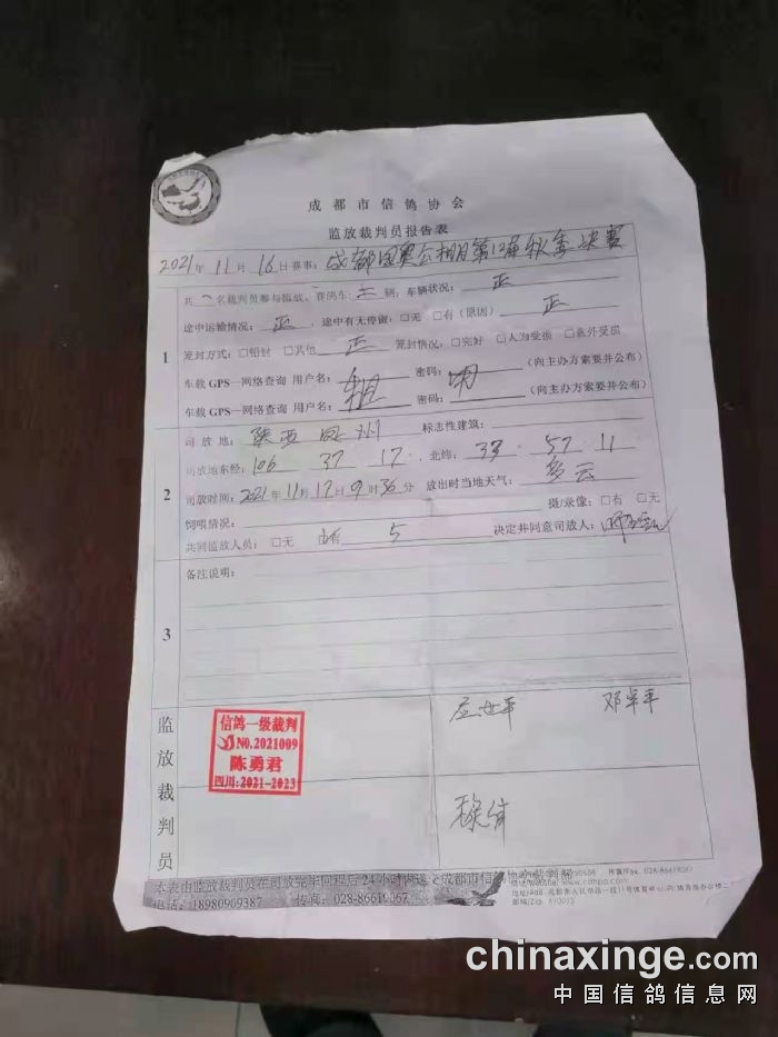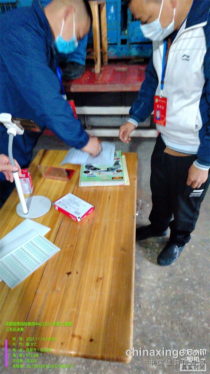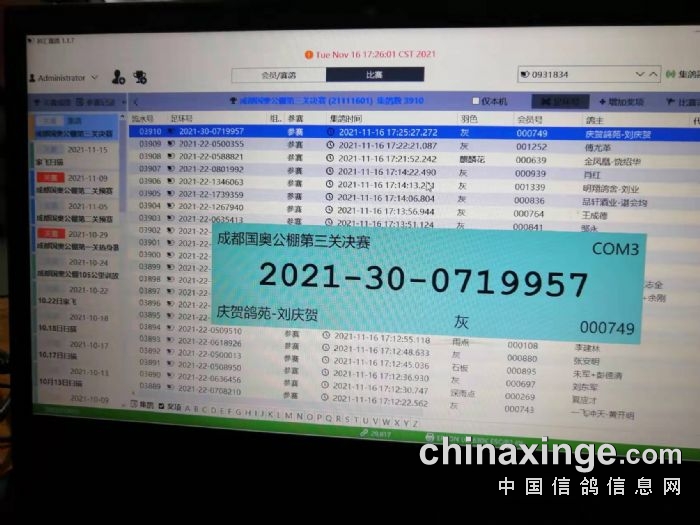 经过近9个小时的漫长集鸽,裁判员们逐羽扫描、盖暗记章、唱环、上笼,并同步打印备查,全棚赛鸽完成上笼。第一羽扫描时间2021年11月16日上午9:30,环号为:2021-22-2222994,最后一羽扫描时间2021年11月16日17:25,环号为:2021-30-0719957,共集鸽3910羽,上笼数据真实有效。