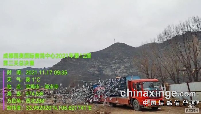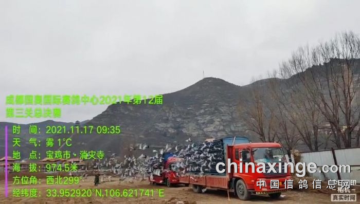 裁判员给鸽车上铅封后,鸽车出发前往司放地。司放地位于凤州,经纬度为:东经 106°37′18.0000″,北纬 33°57′10.0000″,实际空距446。