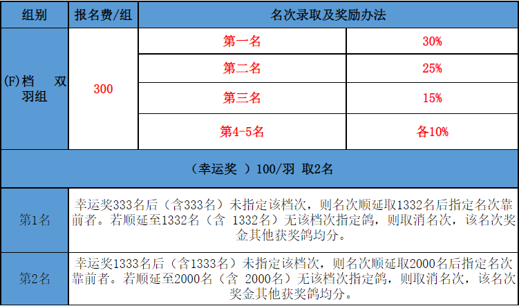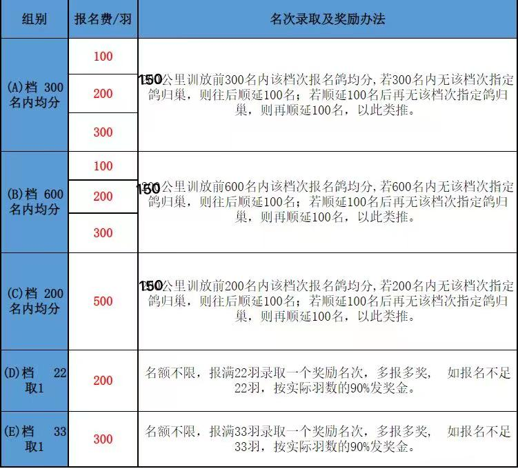 | 1、 150公里训放单羽指定鸽分A档、B档、C档、D档、E档、F档,报名费(元)及录取名次如下表: |