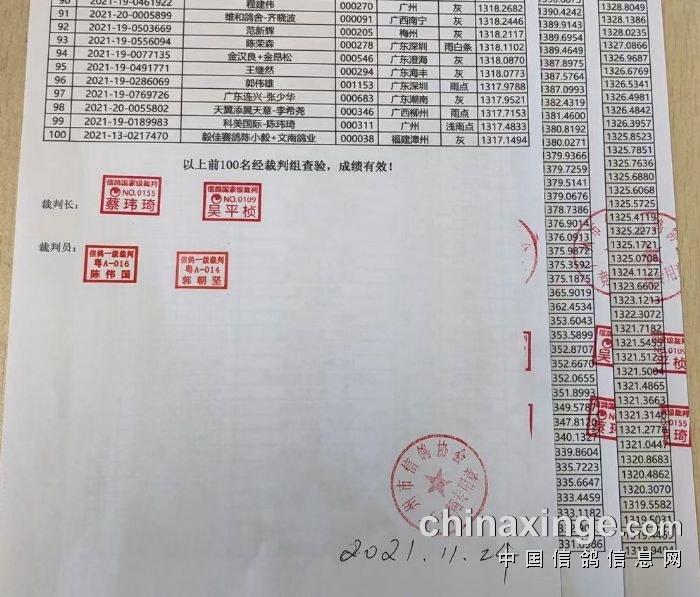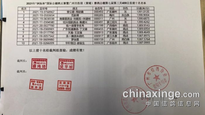 广州浩羽(黄埔)公棚第一关热身赛前100名获奖鸽名单