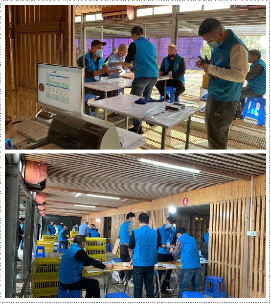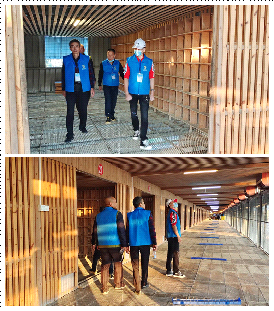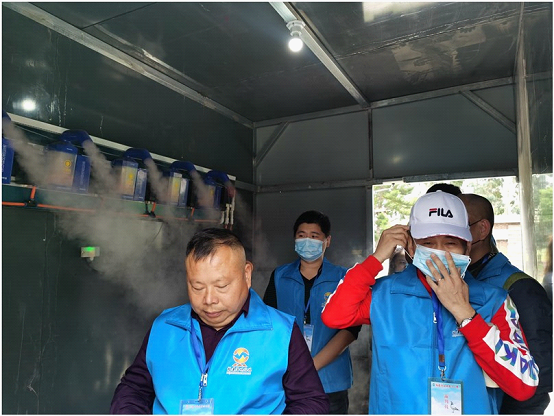 裁判组成员入棚集鸽前进行消毒