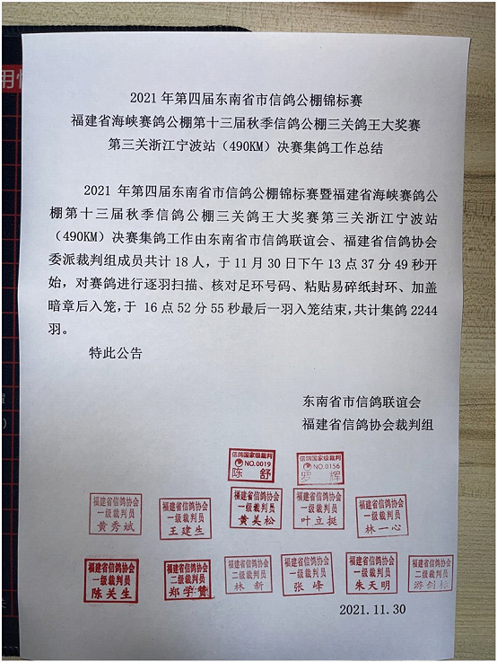 集鸽公告,共计集鸽2244羽