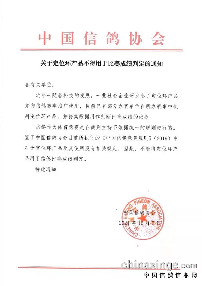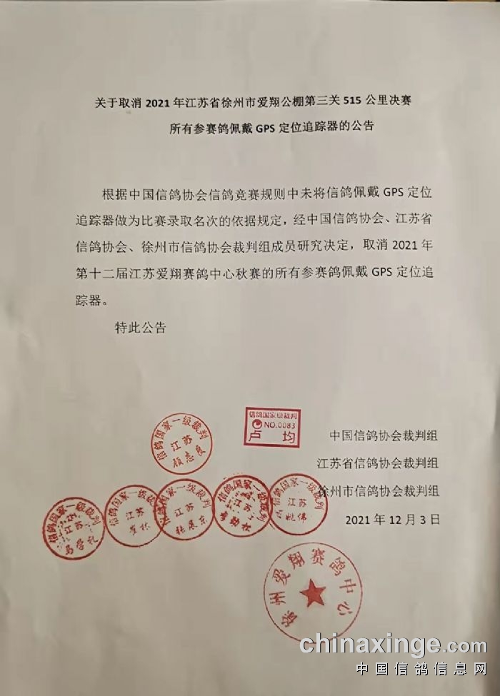 根据中国信鸽协会信鸽竞赛规则中未将信鸽佩戴GPS定位追踪器做为比赛录取名次的依据规定,经中国信鸽协会、江苏省信鸽协会、徐州市信鸽协会裁判组成员研究决定,取消2021年第十二届江苏爱翔赛鸽中心秋赛的所有参赛鸽佩戴GPS定位追踪器。