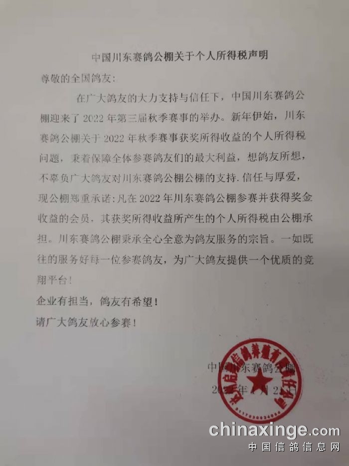 中国川东赛鸽公棚关于个人所得税声明