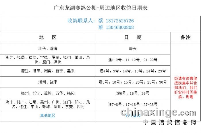 广东龙湖赛鸽公棚-周边地区收鸽日期表
