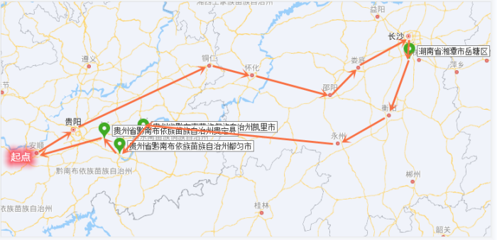 从贵阳出发,途经铜仁、怀化、邵阳、娄底、长沙、湘潭、衡阳、