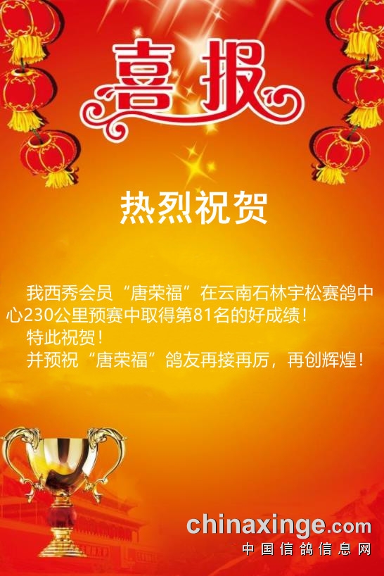 西秀赛鸽:热烈祝贺“唐荣福”