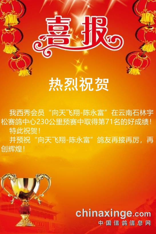 西秀赛鸽:热烈祝贺“向天飞翔-陈永富”