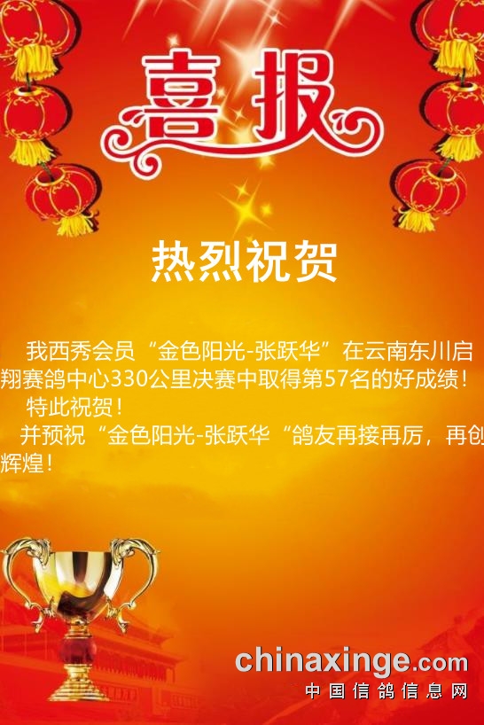 西秀赛鸽:热烈祝贺“金色阳光-张跃华”
