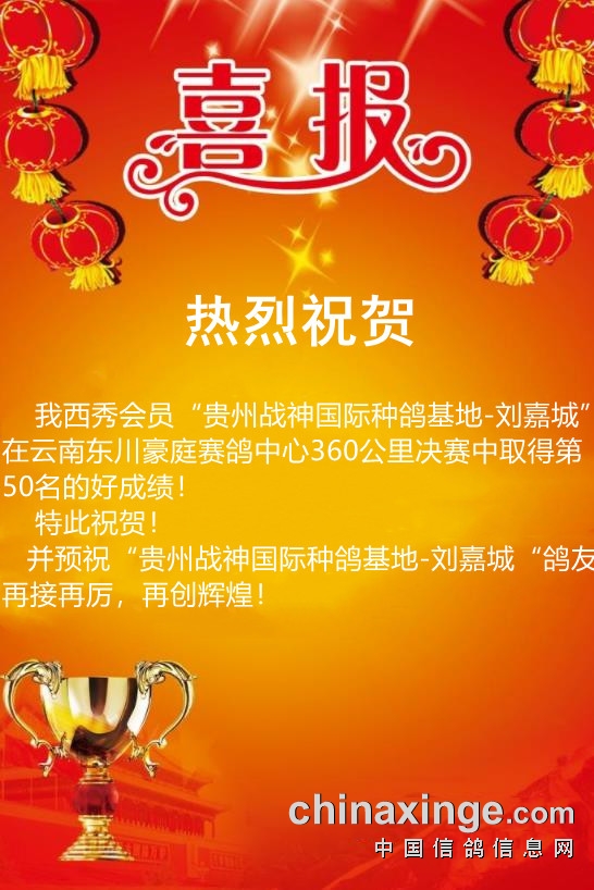 西秀赛鸽:热烈祝贺“贵州战神国际种鸽基地-刘嘉城”