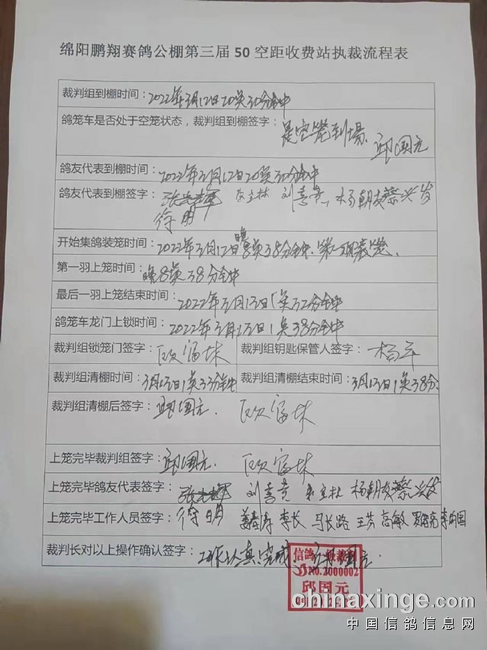 四川绵阳鹏翔赛鸽公棚50空距收费站执裁流程表