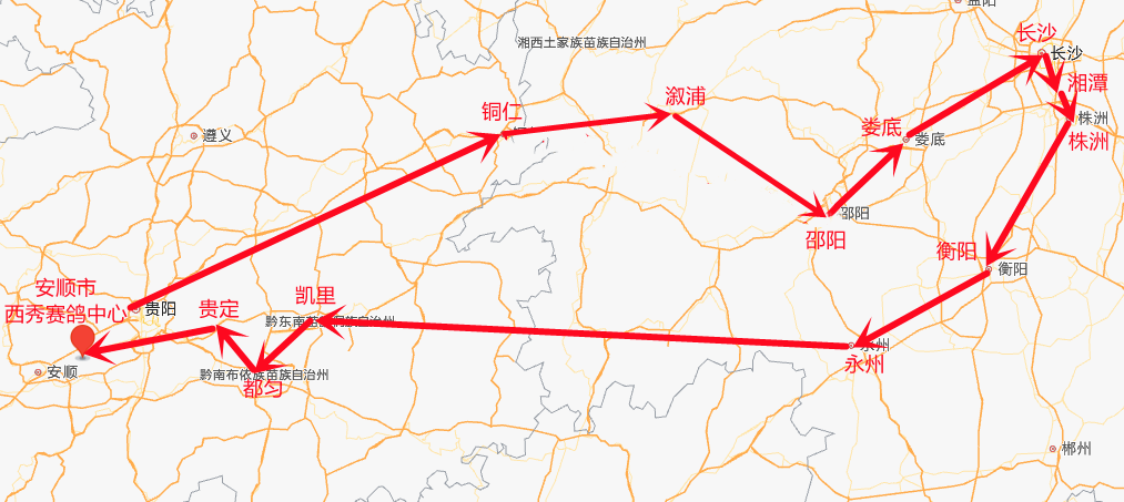 从贵阳出发,途经铜仁、溆浦、邵阳、娄底、长沙、湘潭、衡阳、永州、凯里、都匀、贵定,最后到达安顺市西秀赛鸽中心。