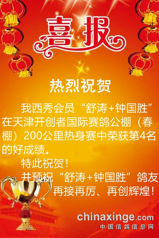 西秀赛鸽:热烈祝贺“舒涛+钟国胜”