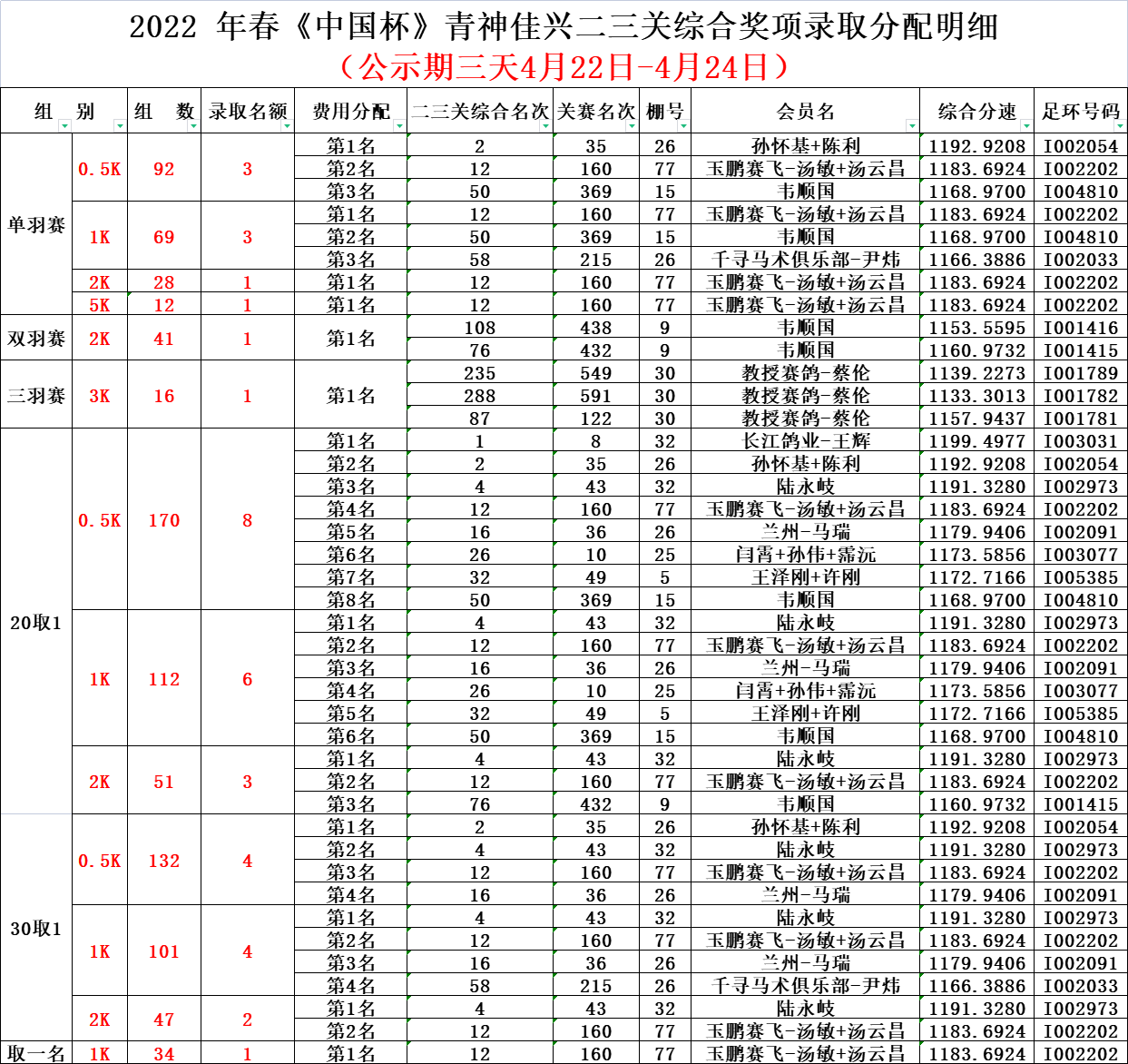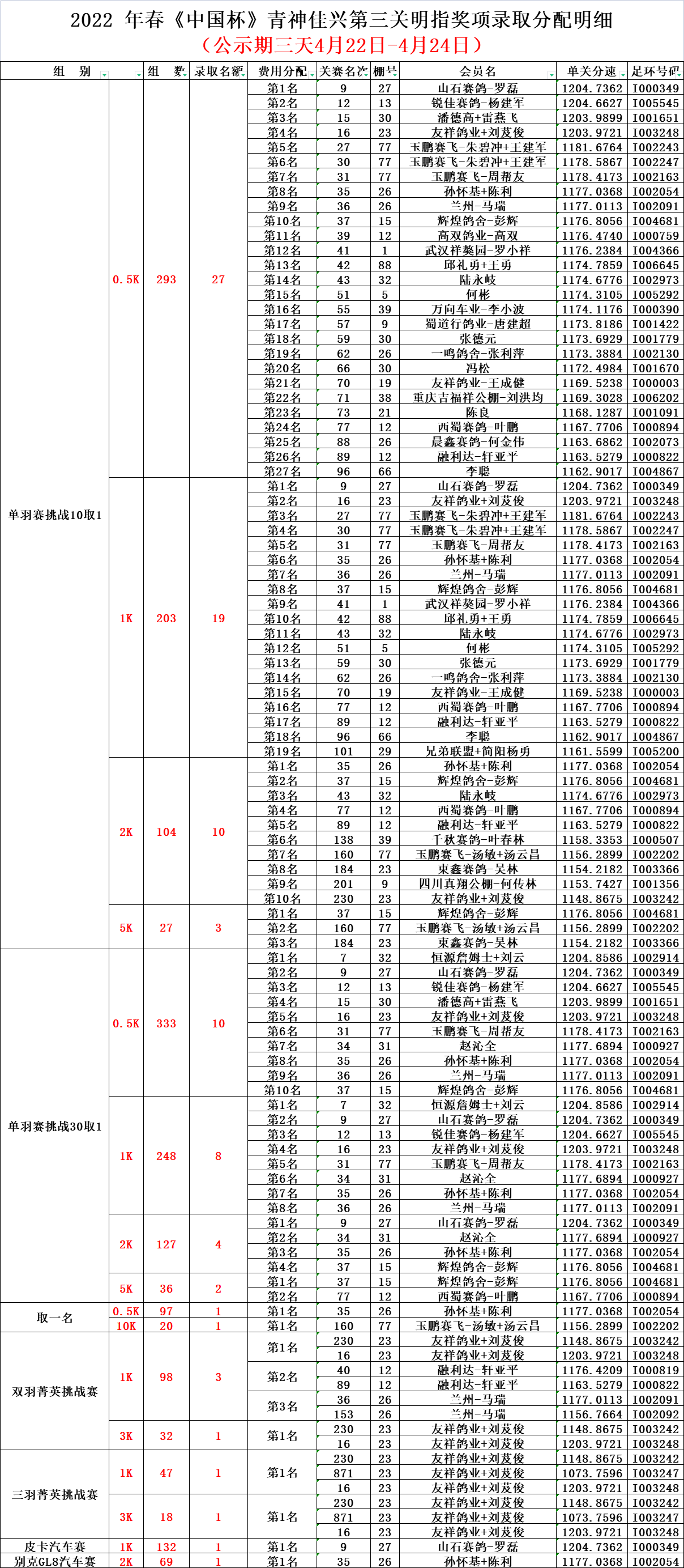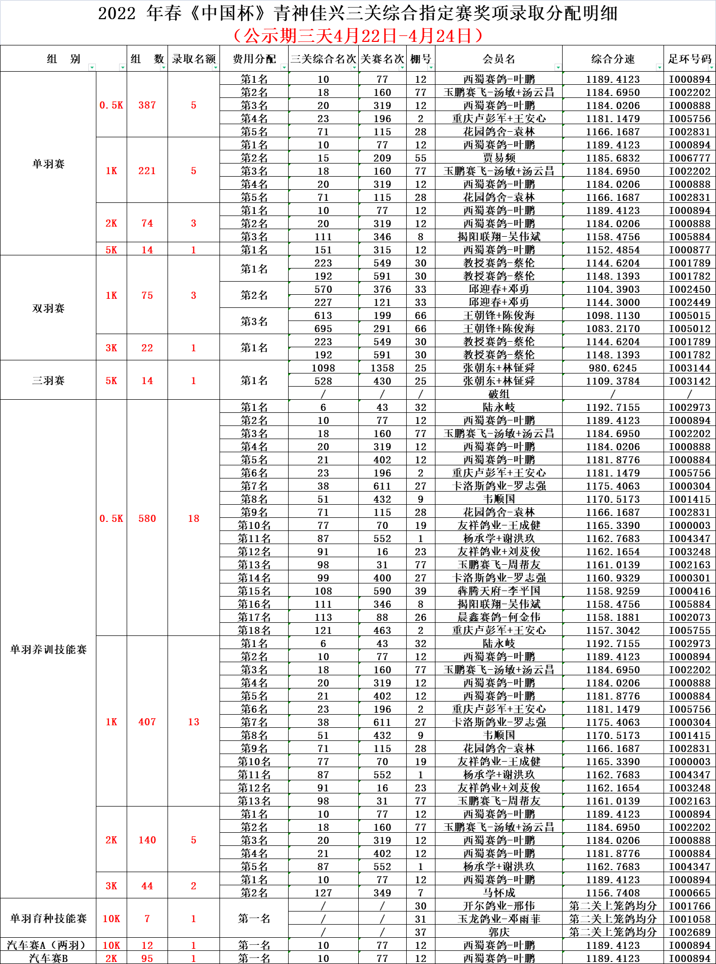 2022年春《中国杯》四关职业联赛佳兴分站第三关500公里比赛经中国信鸽协会委派裁判、眉山市信鸽协会、青神县信鸽协会、温江区信鸽协会等共同执裁,第三关比赛及验鸽工作已全部结束。本次比赛上笼共计39舍2094羽,有效归巢鸽39舍1618羽,失格0舍476羽,有格率7.7成。比赛成绩及录取明细将公示三天,(4月22日-4月24日)三天无异议则此暂排成绩自动转为正式生效成绩,各奖项将在公示期结束后统一发放。