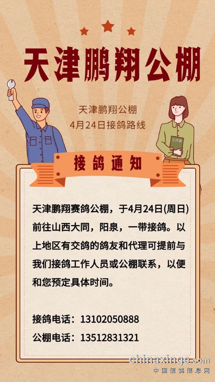 天津鹏翔公棚4月24日周日前往山西一带接鸽