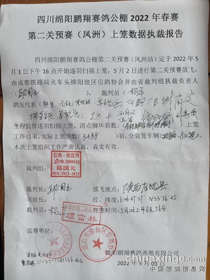 四川鹏翔公棚第二关预赛上笼数据