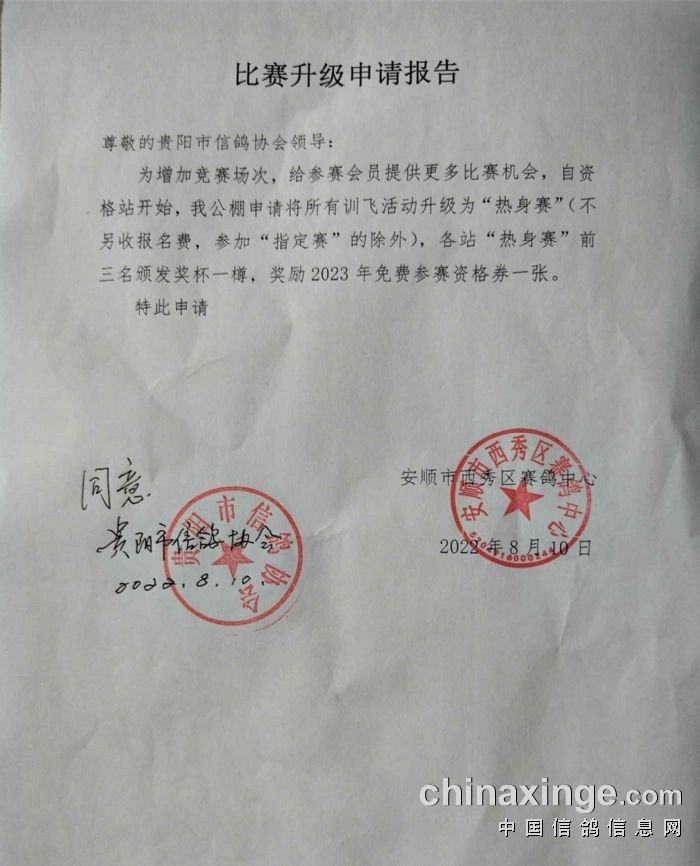 为增加竞赛场次,给参赛会员提供更多比赛机会,自资格站开始,我公棚申请将所有训飞活动升级为“热身赛”(不另收报名费,参加“指定赛”的除外),各站“热身赛”前三名颁发奖杯一樽,奖励2023年免费参赛资格券一张。