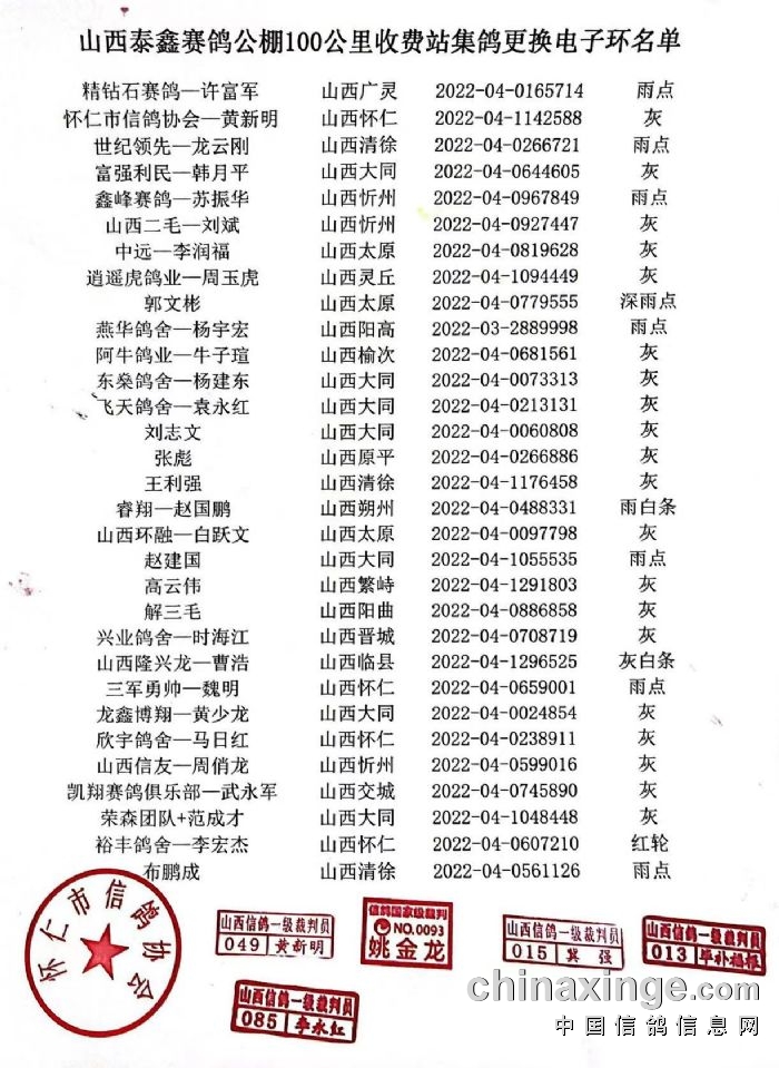山西泰鑫赛鸽公棚100公里收费站集鸽更换电子环名单