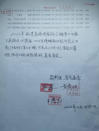 福建省海峡赛鸽公棚第十四届秋季信鸽公棚三关鸽王大奖赛2022年100公里资格赛(清棚收费站)工作总结