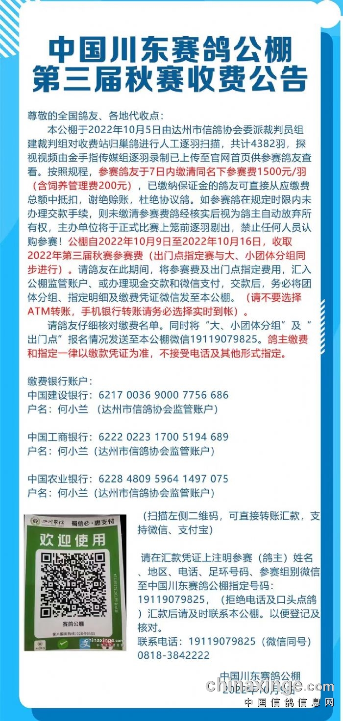 中国川东赛鸽公棚第三届收费公告
