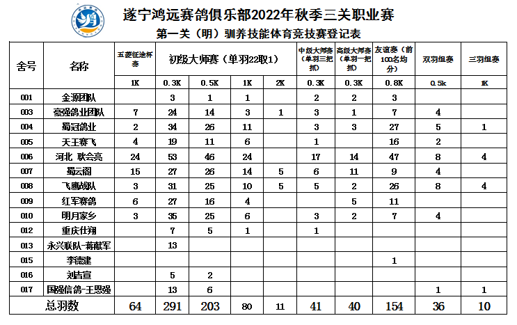 各参赛团队(鸽友):经过认真有序的统计各团队提交的资格赛各项参赛数据,现将各团队(参赛鸽友)的参赛数据公示如下: