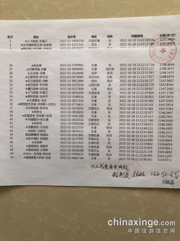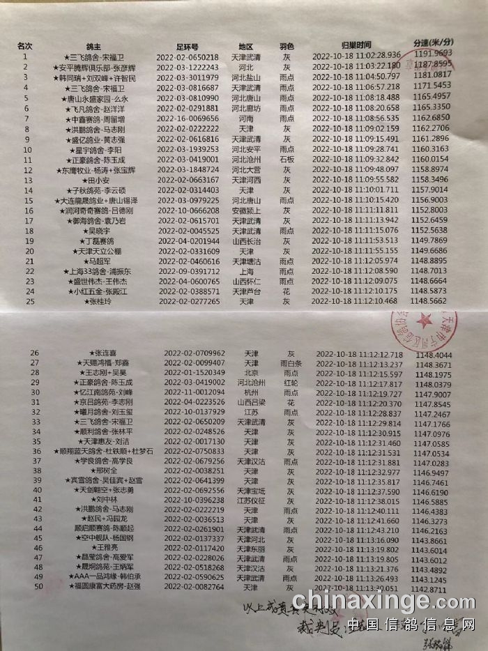 天津鹏翔公棚第一关300公里(预赛)经由宁河区信鸽协会领导指裁前50名获奖鸽成绩真实有效!