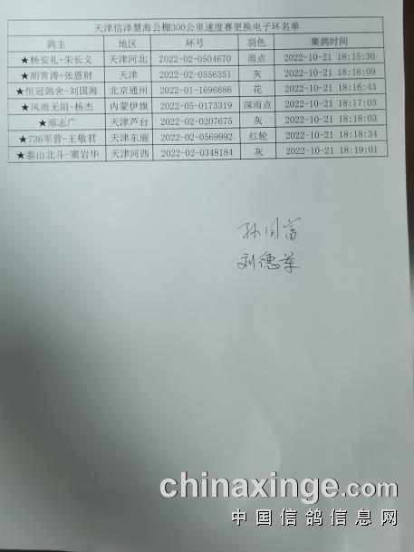 天津信泽慧海公棚300公里速度赛更换电子环清单