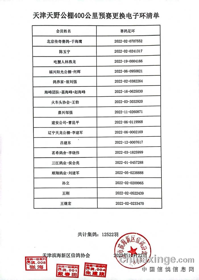 天津天野公棚加站赛516公里三日归巢数据