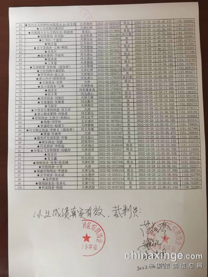 天津信泽慧海公棚400公里半决赛赛获奖鸽成绩名单