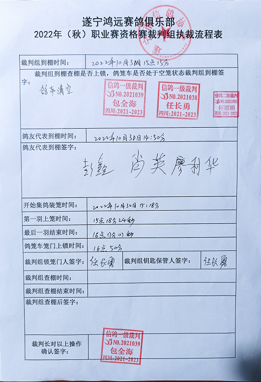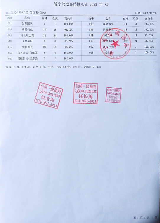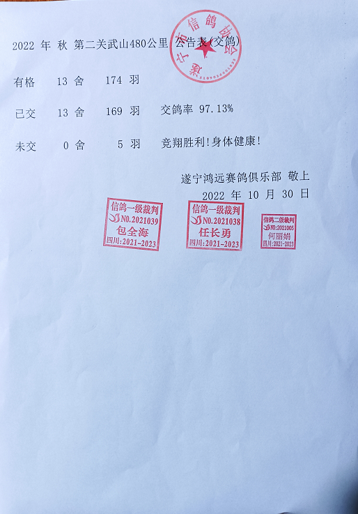 遂宁鸿远赛鸽俱乐部2022年(秋)三关综合鸽王职业赛第二关武山站集鸽工作在四川省信鸽协会委派和遂宁市信鸽协会执裁裁判的认真执裁下,经全体参赛团队(鸽友)积极参与和支持,已于2022年10月30日16点30分圆满结束。总集鸽羽数169羽。现将集鸽执裁报告及相关数据公示如下(所有集鸽原始单据、存根由执裁裁判保管,待比赛结束验鸽时开启核对)。