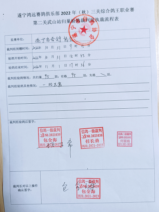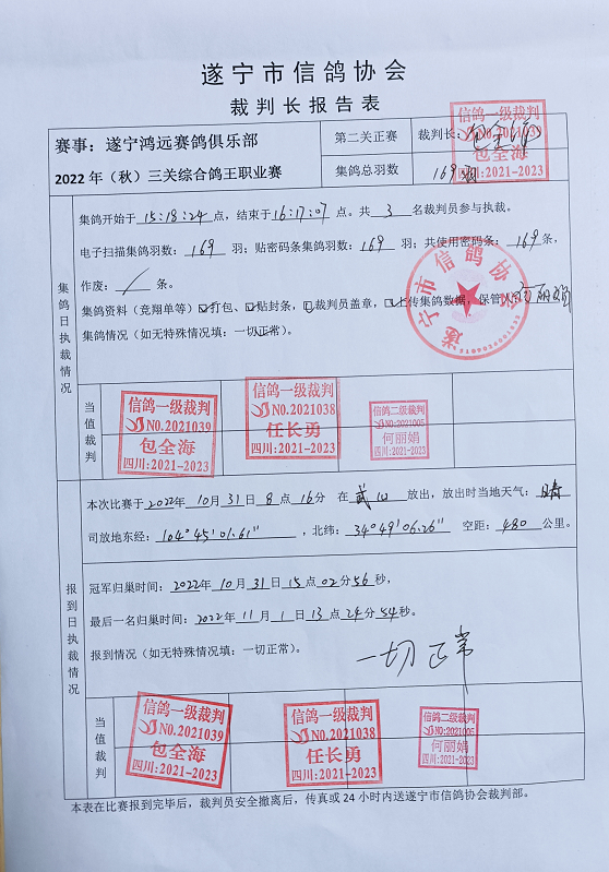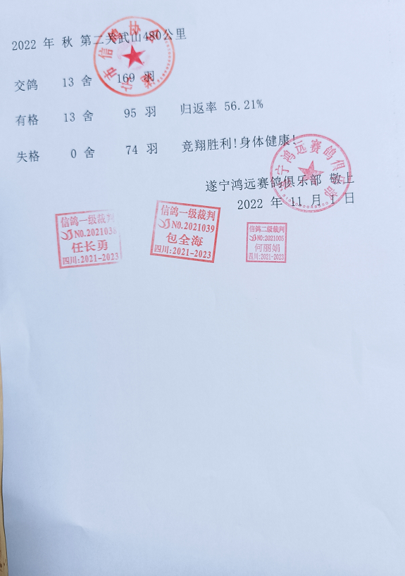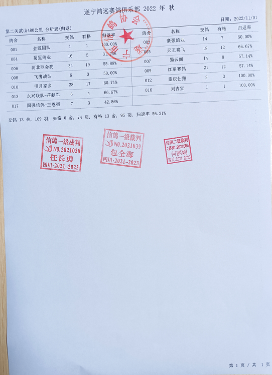 2022年(秋)遂宁鸿远赛鸽俱乐部三关综合鸽王职业赛 第二关武山站,在四川省信鸽协会委派的裁判认真执裁下,经全体参赛团队(鸽友)、鸽友代表积极参与和监督下,已于2022年11月1日圆满结束。第二关司放地为武山县鸳鸯服务区,约480空距。本次第二关武山站在裁判组认真、仔细、有序的执裁和各参团队(鸽友)的积极配合下,共计交鸽:13舍,169羽,有格归巢13舍95羽,失格0舍74羽,归还率56.21%。现将具体数据公布如下: