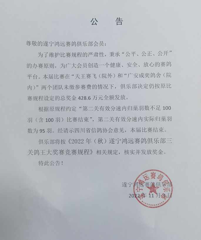 关于举办2025年秋第四届“鸿远杯” 三关综合鸽王职业赛奖励资金的公告
