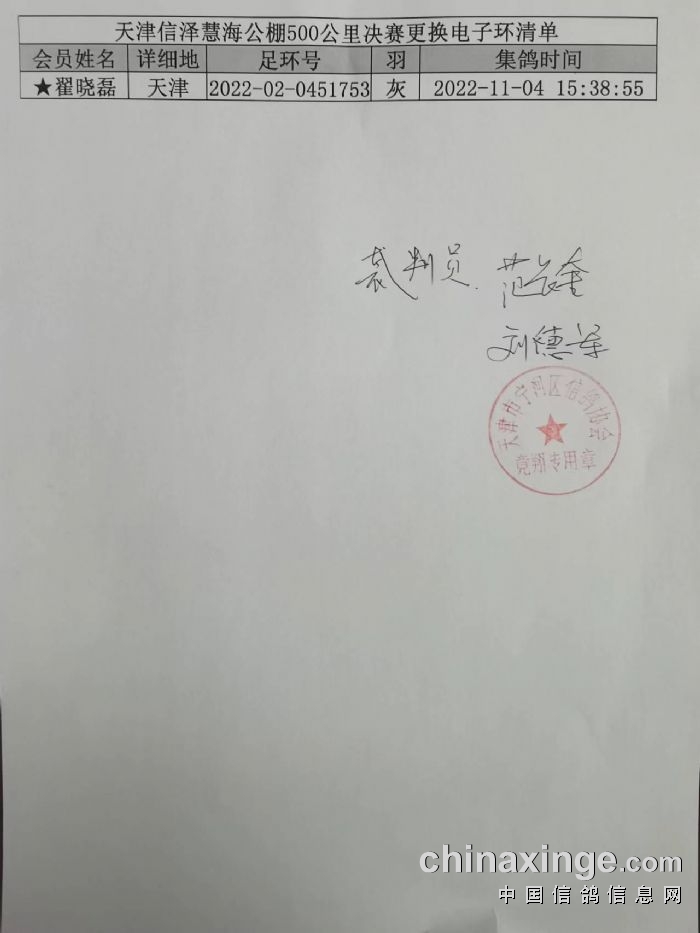 天津信泽慧海公棚500公里决赛更换电子环清单